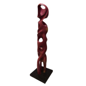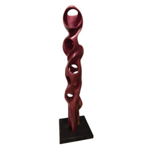 Le traitement de surface, volontairement lisse et poli, révèle avec une grande maîtrise le grain et les veines du bois, dont la qualité exceptionnelle confère à la sculpture une douceur tactile presque organique. Issu d’un bois précieux d’Afrique du Sud, aux tonalités rosées, le matériau participe pleinement à la charge symbolique de l’œuvre, oscillant entre chaleur, chair et vitalité.