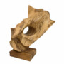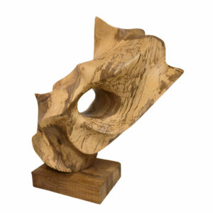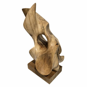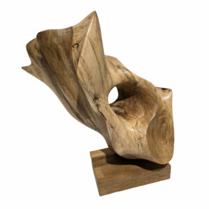 Le dessin du bois se combine aux formes de la sculpture pour vous emmener vers d’autres horizons. Le drapé de cet entrelacs de couleurs nous renvoie à un arc en ciel, une floraison de couleurs qui naissent et s’étiolent au gré des oscillations solaires. Les lentes trépidations d’un rayon de soleil complice viennent langoureusement lécher les rives de la sculpture. Elles adoucissent ses courbes et creusent ses concavités chaudes de couleurs ocres et terre de sienne.