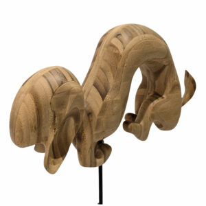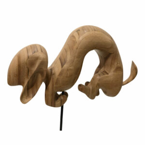 Plein de malice, ce chien en bois de bambou, véritable saucisson sur pattes, se plie et se détend à chaque foulée, capturant avec humour et dynamisme l’énergie joyeuse du mouvement.